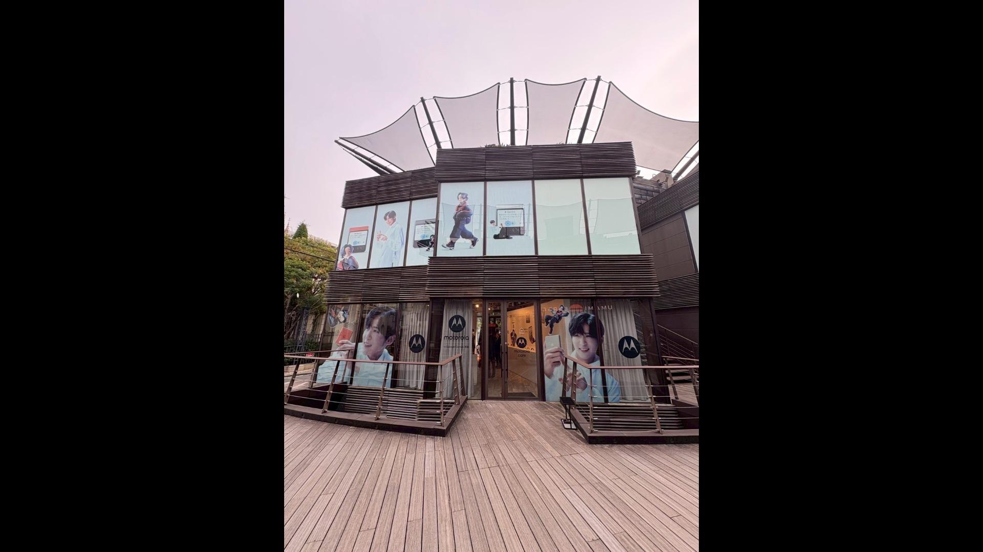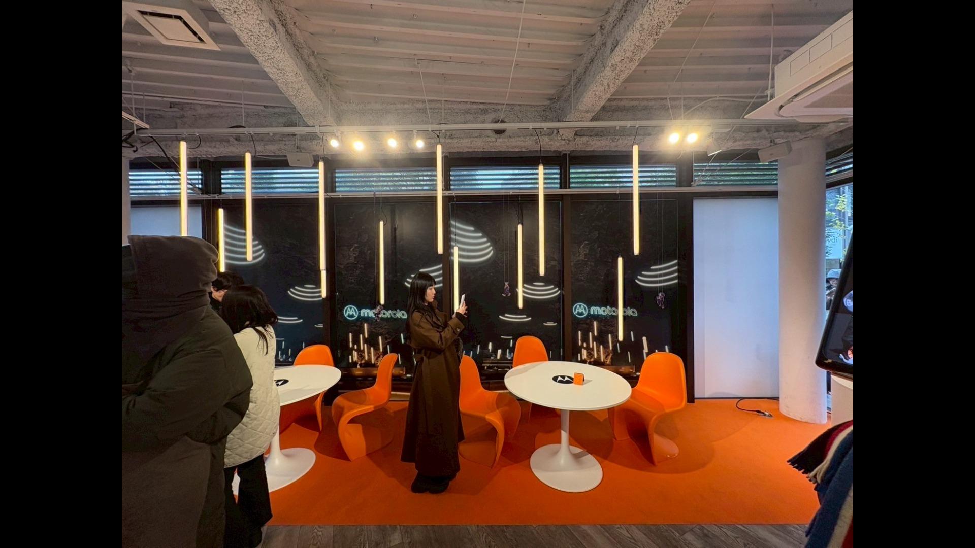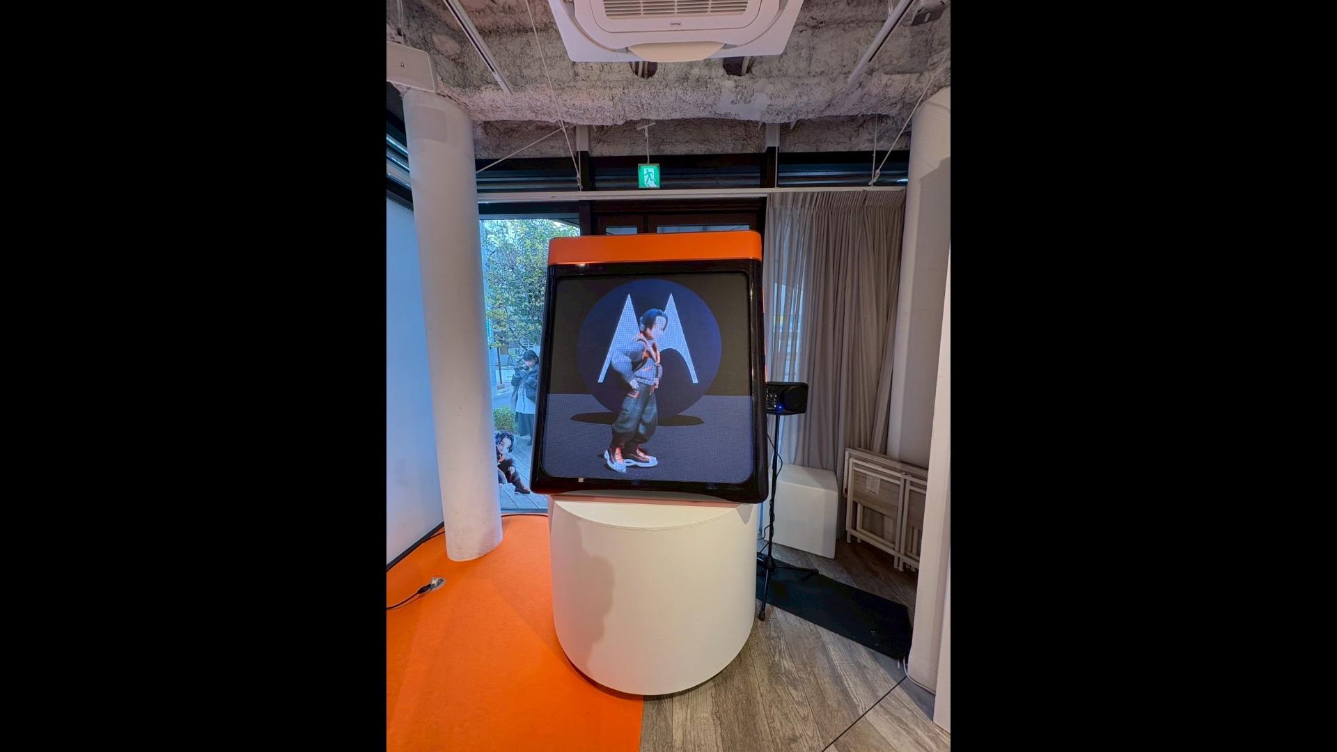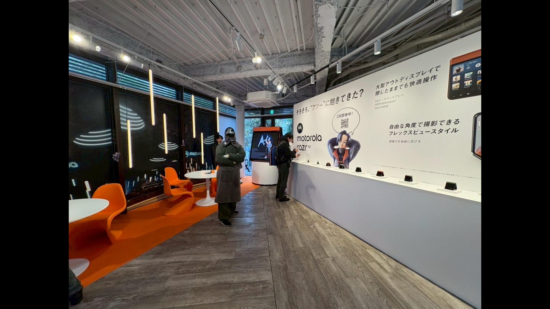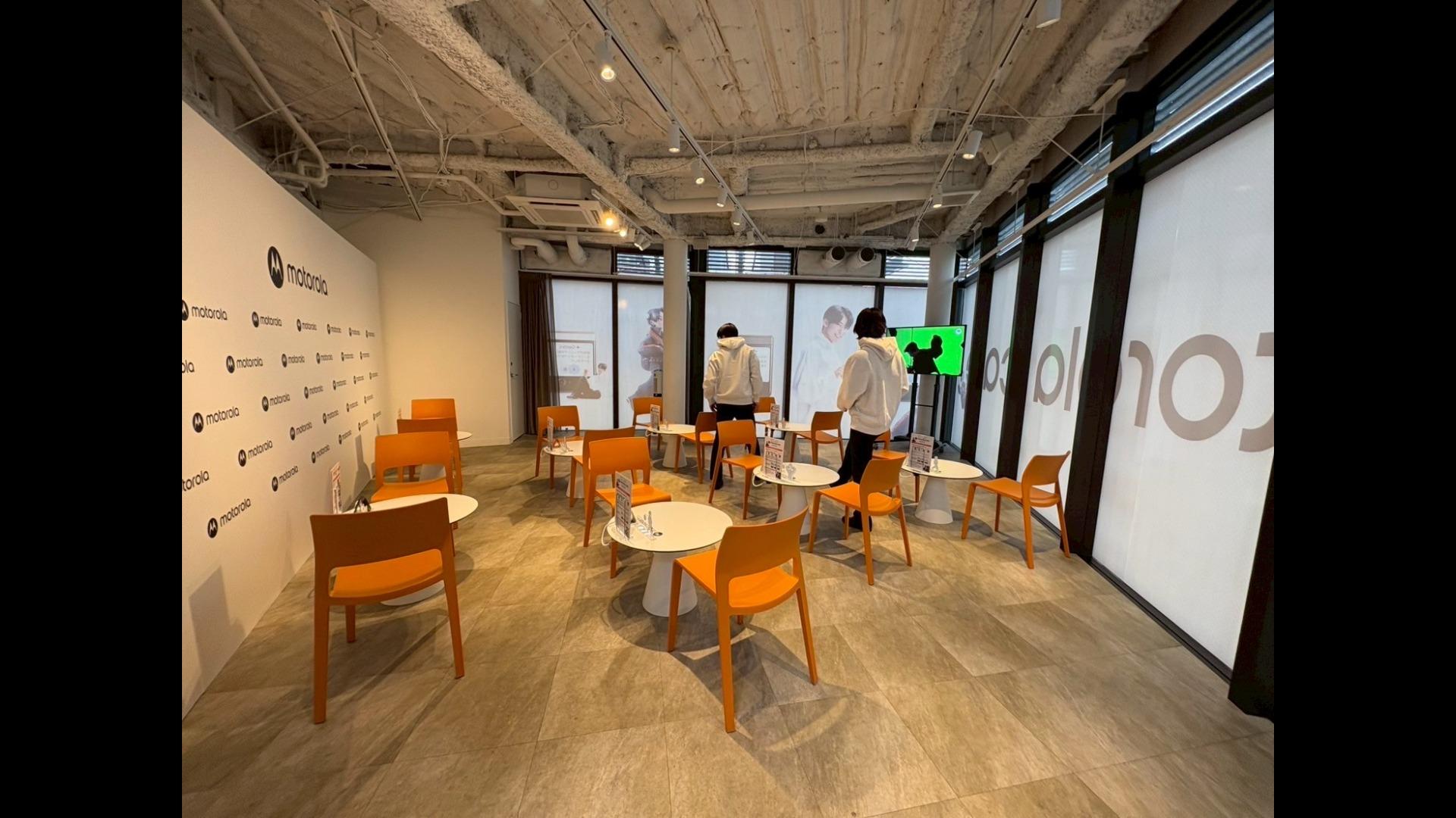 会場は目黒の新しいビジュアルでラッピング。さらに、『motorola razr 50』のタッチ&トライや、実際のCM撮影で使用した椅子などを配したフォトスポット、9月18日より放送されたCM『ひらかれる世界』篇で共演した『motorola razr 50』の分身である相棒のアバター“ミニREN”が映る巨大モックなどが無料で楽しめる。