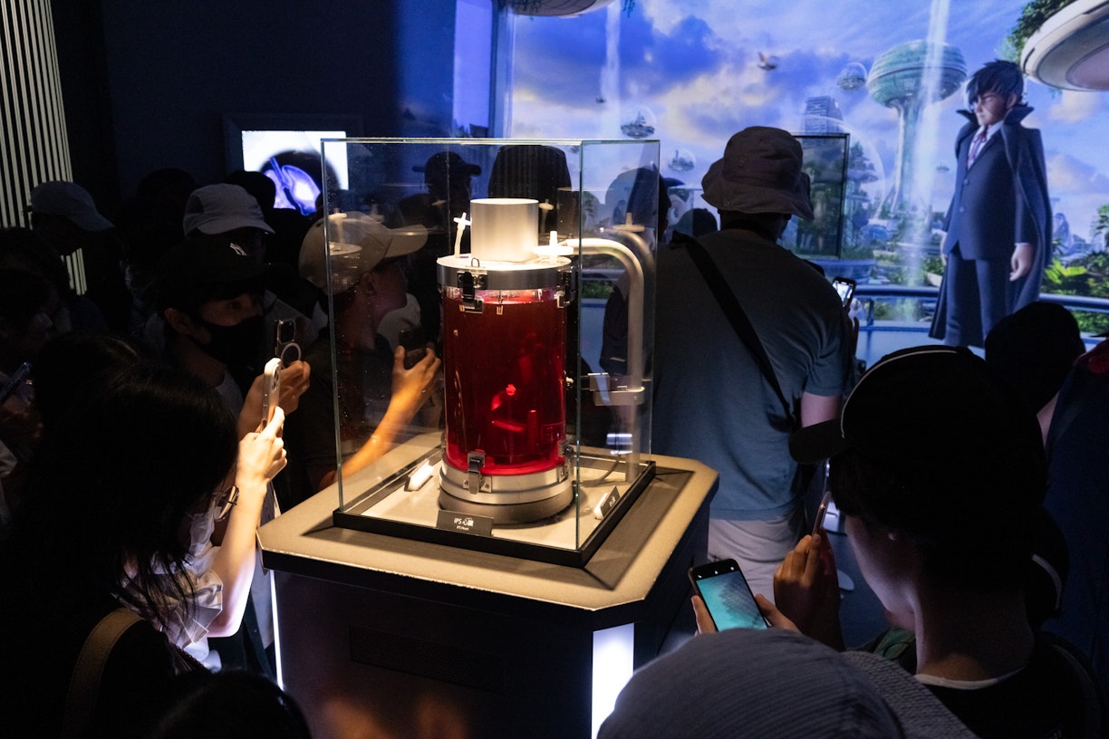 ゲストが必ず足を止める「iPS心臓」。大多数の人が初めて目にする拍動に興奮、多くの目を引き付けるポイントとなっている