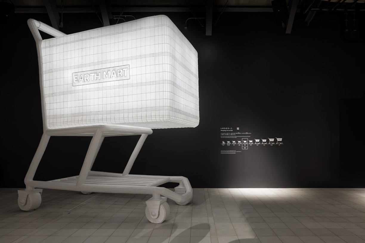 「一生分のたまご」では、日本人ひとりが一生で約2万8000個の卵を食べるという事実を、空間いっぱいに並ぶ卵で表現。さらに「いのちのカート」では、日本人が10年間で消費する食料の体積を巨大なショッピングカートで可視化し、来場者に圧倒的なスケール感を与えます。