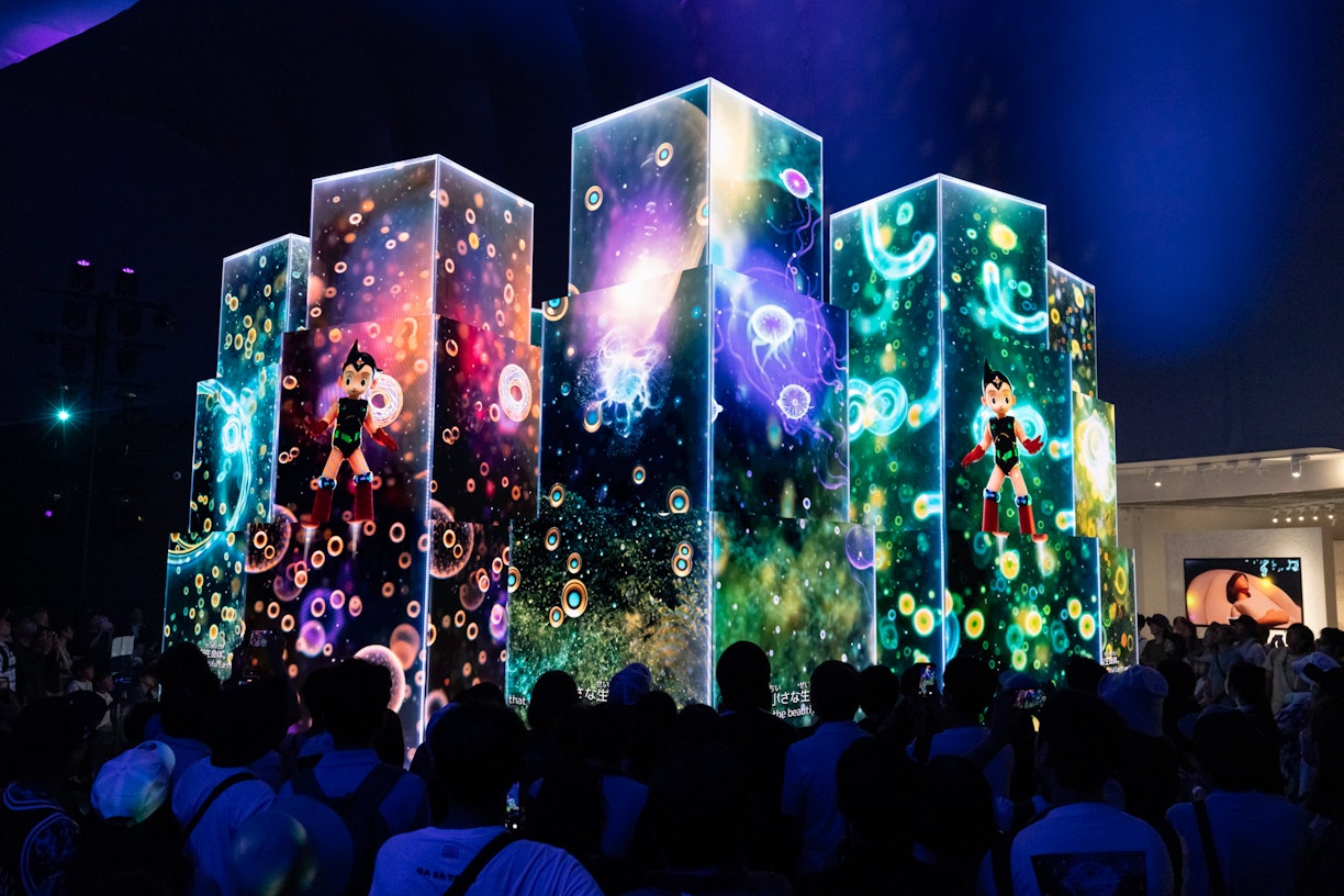 「ノモの国」の内部に入ると、ピンク色の光の粒が床や壁に投影され、まるで身体ごと映像世界に溶け込むような没入感。足元に広がる光の粒が来場者の動きに呼応することで、自分自身の存在が空間とつながっていく感覚を得られます。こうした体験は「自然と人間の境界を溶かす」ことを意図した演出であり、五感を通じてテーマを直感的に理解できるよう設計されています。