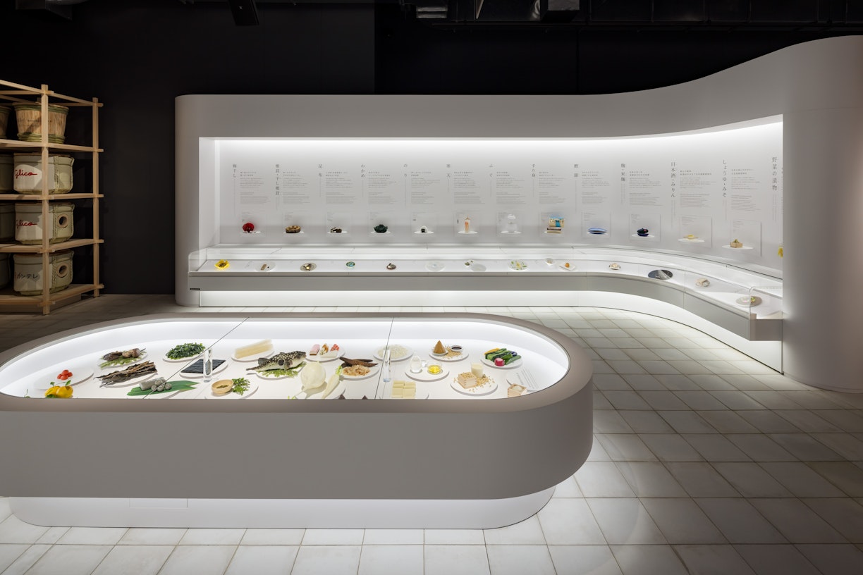 後半の「未来のフロア」では、伝統と最新技術が交わる空間演出が際立ちます。「未来を見つめる鮨屋」では、すきやばし次郎の小野二郎氏が養殖魚を握る映像と共に、カウンターを模した空間に来場者を迎え、鮨文化の未来を考える場を演出しています。