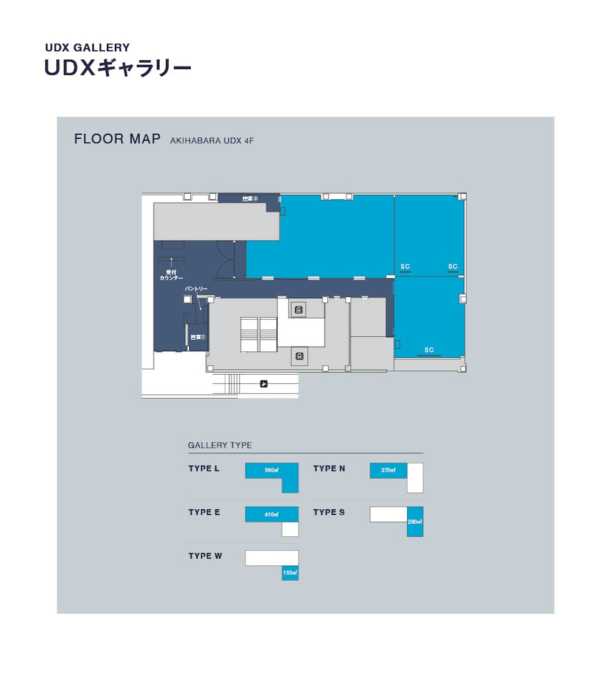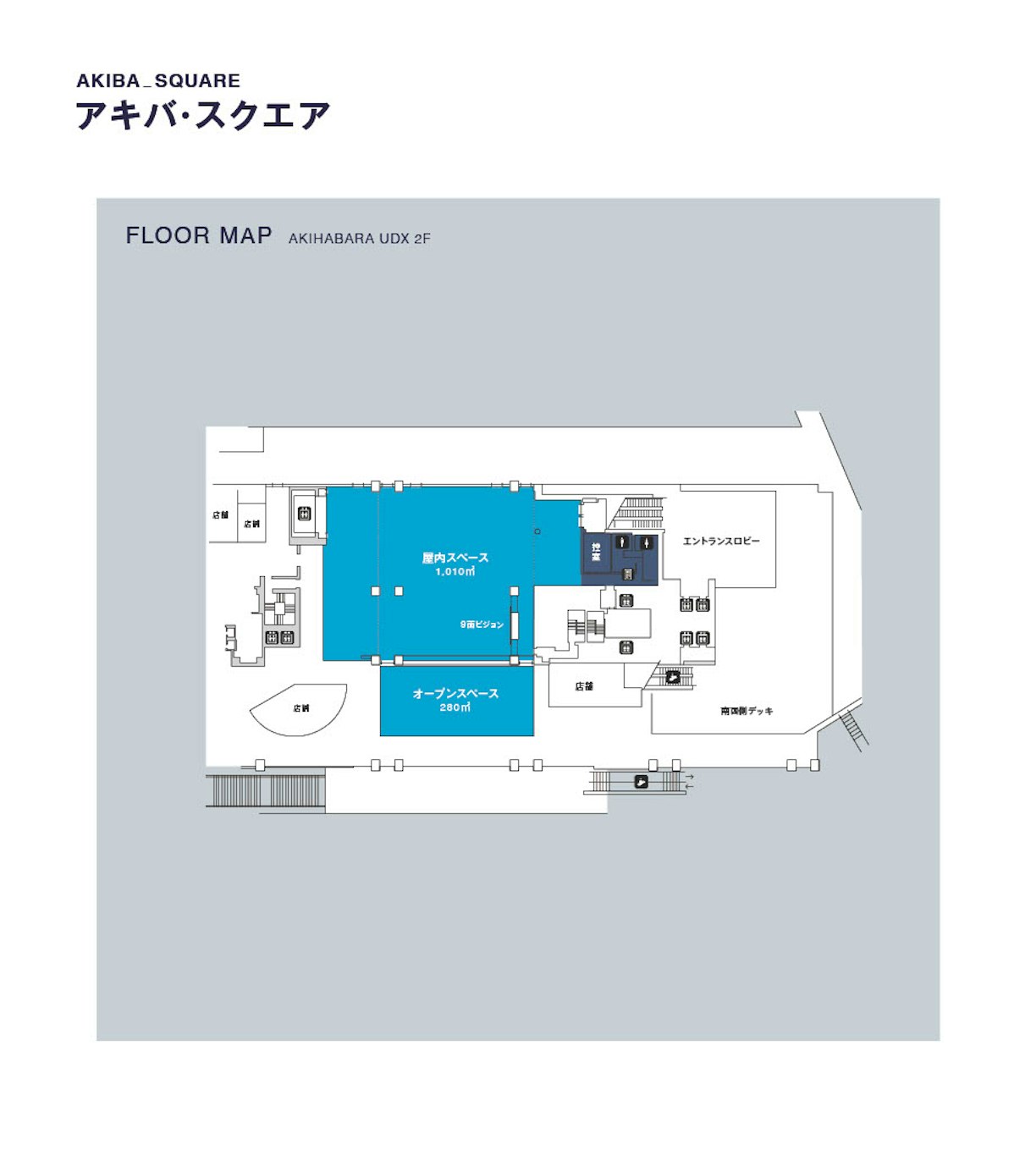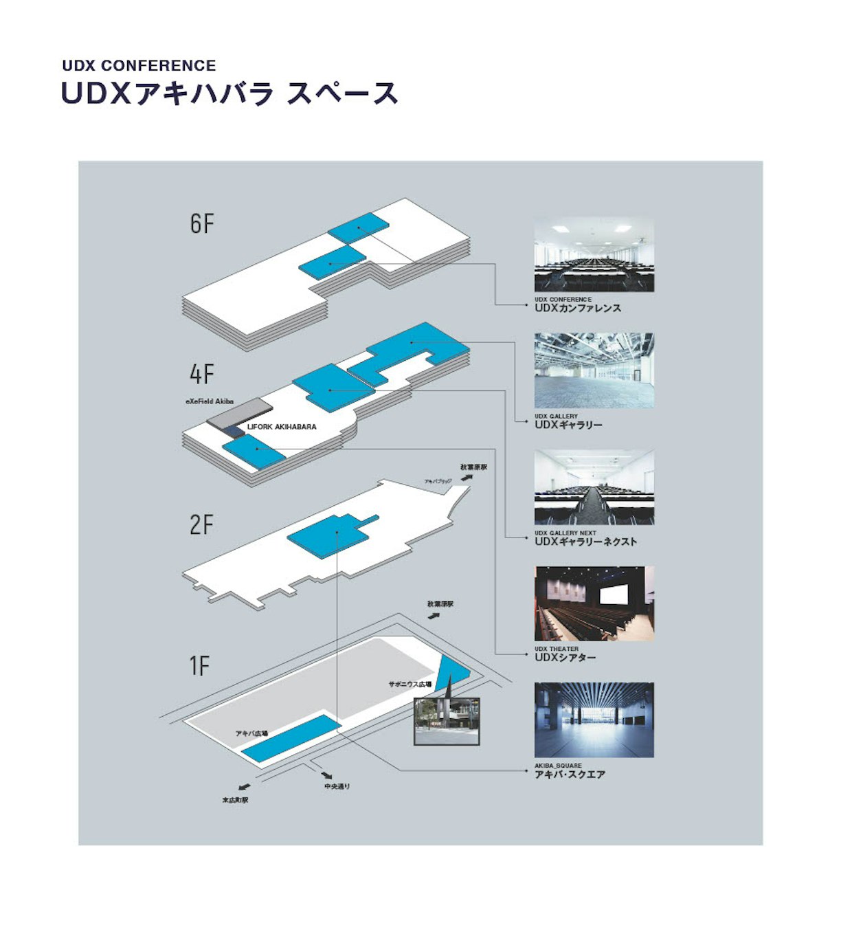 「UDXアキハバラ スペース」は、「アキバ・スクエア」「UDXシアター」「UDXギャラリーネクスト」「UDXギャラリー」「UDXカンファレンス」の計5つのスペースで構成。展示会や発表会など、年間を通して多種多様なBtoC/BtoBのイベントを開催しています。