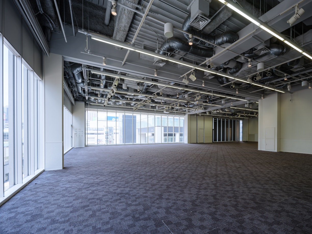 足元から天井までの大きな窓から外光が差し込み、明るくて開放感抜群の空間。天井高約4m 、L字型の広々とした空間は、可変式の仕切りを利用して様々なレイアウトに対応できます。さらに、控え室と受付が常備されており、イベントの際には非常に使いやすい構造です。