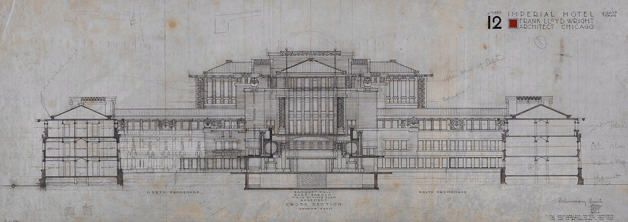 日本初公開となる精緻で華麗な建築図面や、3Dプリンタで制作した100年前の帝国ホテル模型など見どころ満載。帝国ホテル二代目本館(東京、日比谷)第2案 1915年 横断面図 コロンビア大学エイヴリー建築美術図書館フランク・ロイド・ライト財団アーカイヴズ蔵 The Frank Lloyd Wright Foundation Archives (The Museum of Modern Art | Avery Architectural & Fine Arts Library, Columbia University, New York)