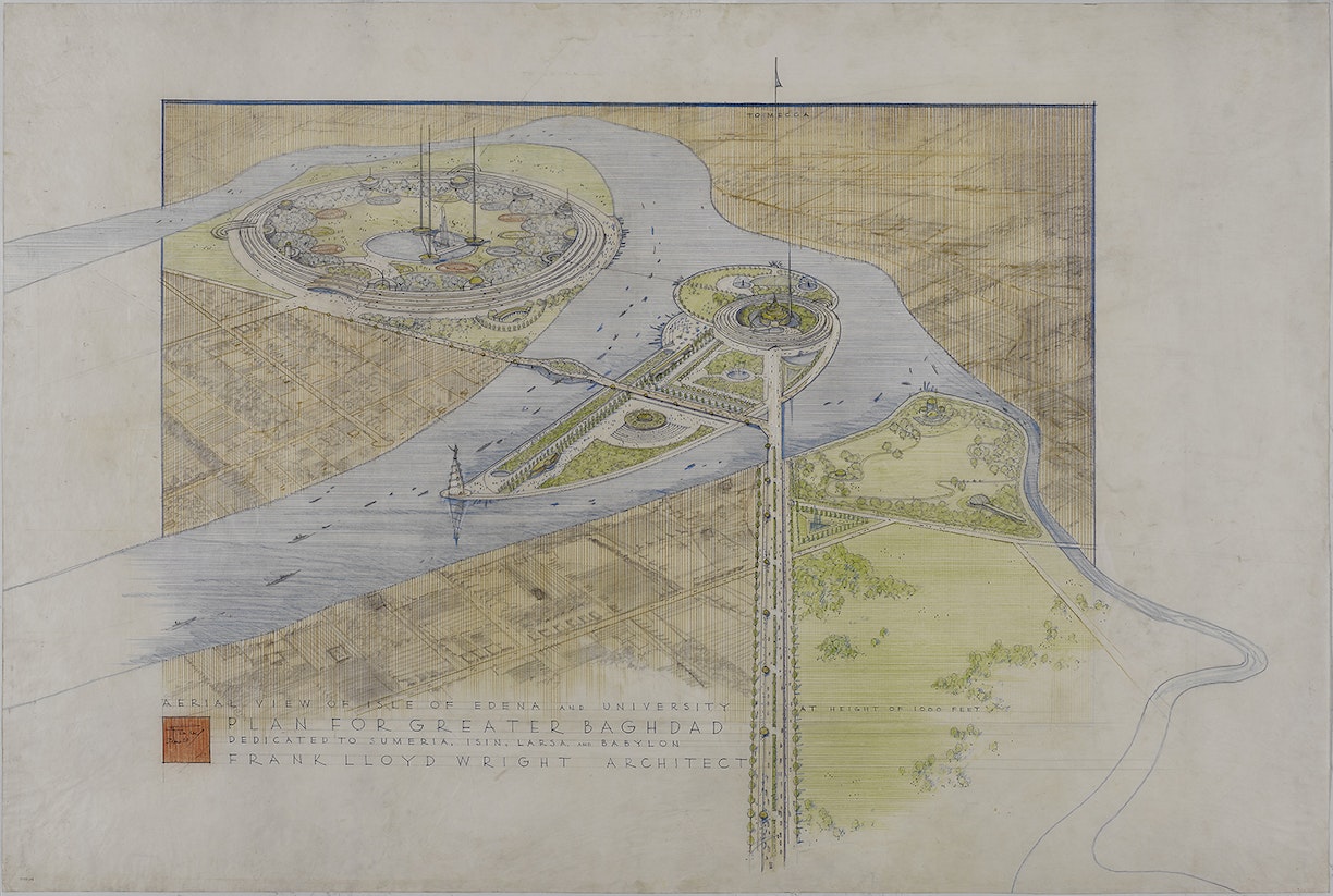 イスラム文化との出会いから生まれた美しい都市像、大バグダッド計画案(イラク、バグダッド)1957年 鳥瞰透視図 北から文化センターと大学をのぞむ コロンビア大学エイヴリー建築美術図書館フランク・ロイド・ライト財団アーカイヴズ蔵 The Frank Lloyd Wright Foundation Archives (The Museum of Modern Art | Avery Architectural & Fine Arts Library, Columbia University, New York)