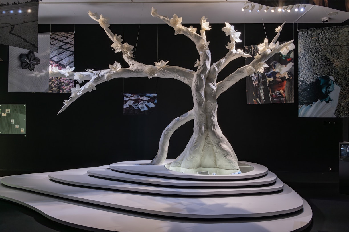 5章は「五月雨よ」ジャケットで強い印象を与えた大樹を展示。6章は未来へのヴィジョンをメンバーの言葉で表現しています。7章の小部屋には「新せ界」のロゴがならび、メンバーが展覧会の感想を直筆で残しています。