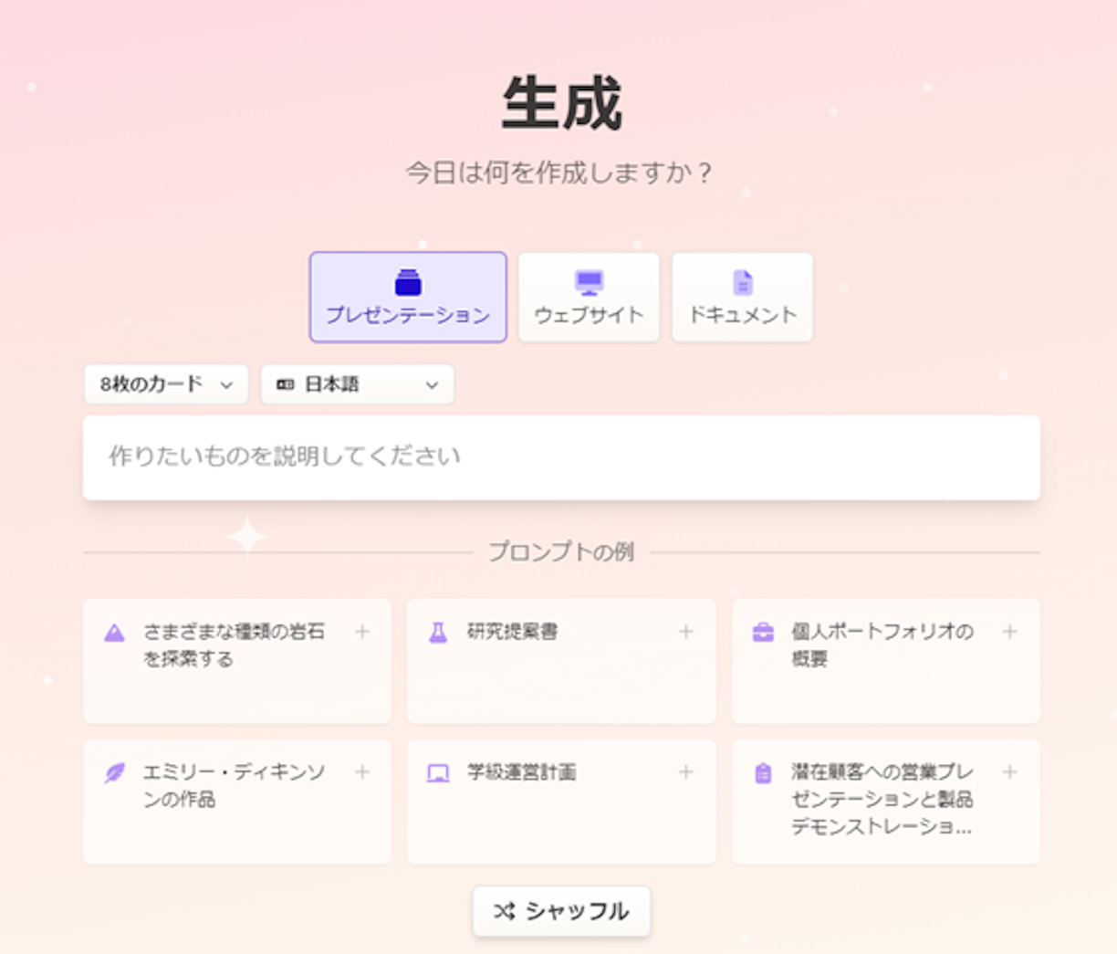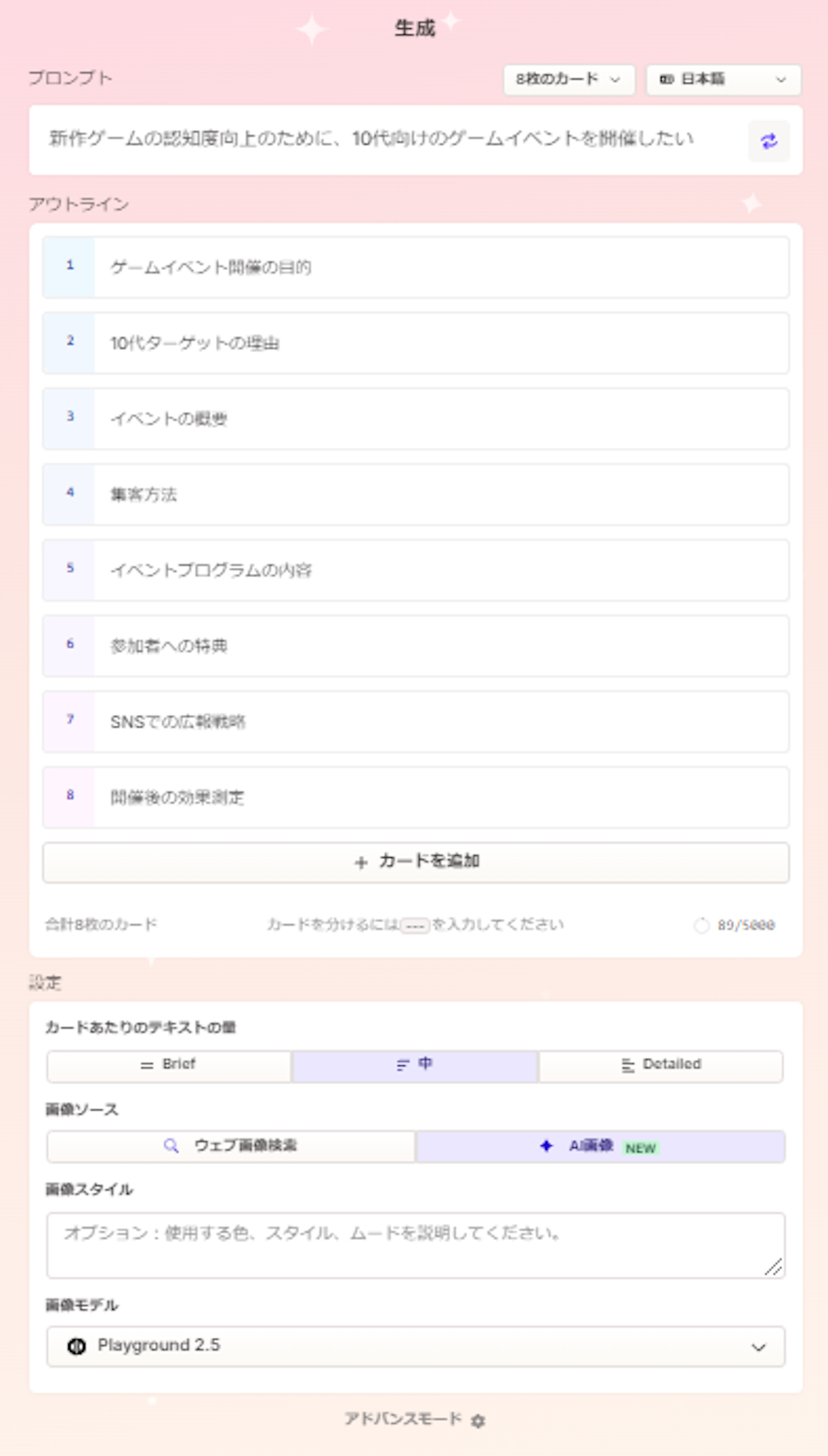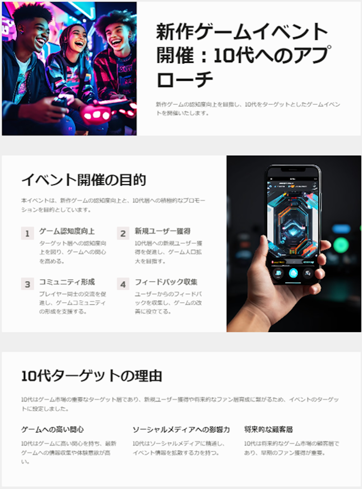 プレゼンテーションを選択し、「作りたいもの」を入力する枠に「新作ゲームの認知度向上のために、10代向けのゲームイベントを開催したい」と書き込んでみます。すると、次のような画面に移行します。