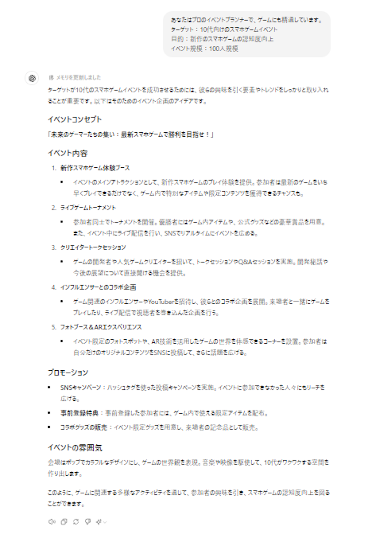 まずは、ChatGPTに企画するイベントに関する情報を整理させましょう。例えば、「10代向けのゲームイベントで新作ゲームの認知度を向上させたい」場合、以下のようなプロンプトを入力します。