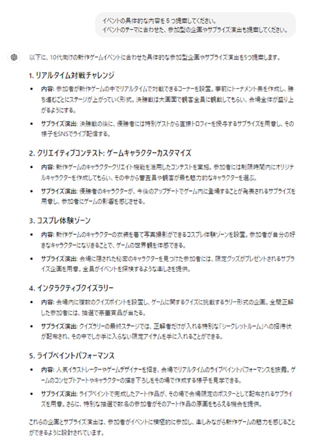 このようにChatGPTは、イベント企画の具体的なアイデアやサプライズ演出の提案を通じて、ターゲット層に合わせた魅力的なイベントを設計するサポートをしてくれます。