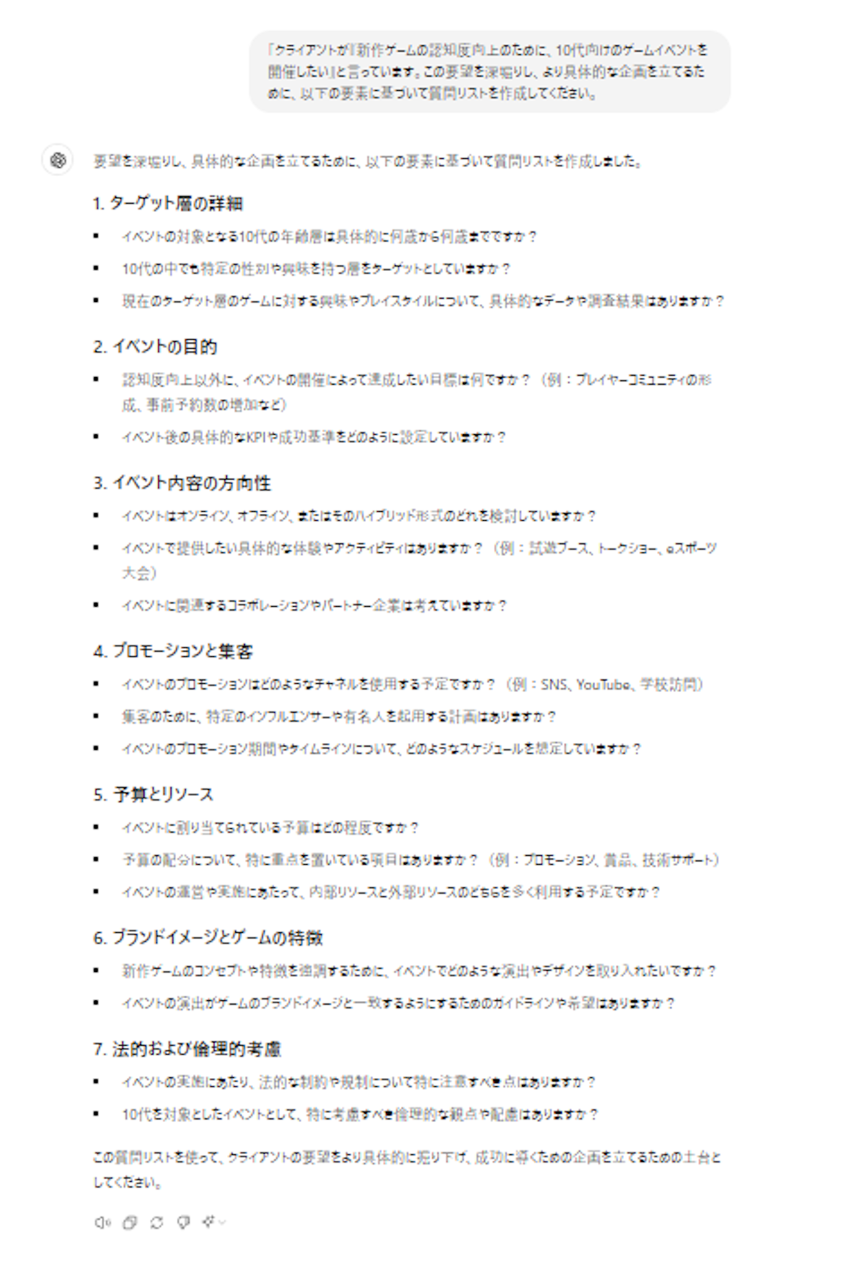 例えば、「新作ゲームの認知度向上のために、10代向けのゲームイベントを開催したい」と言われたとします。企画を立てる前に、クライアントの要望を深堀するために必要な質問リストをChatGPTにつくってもらう場合、次のようなプロンプトを作成してみましょう。
