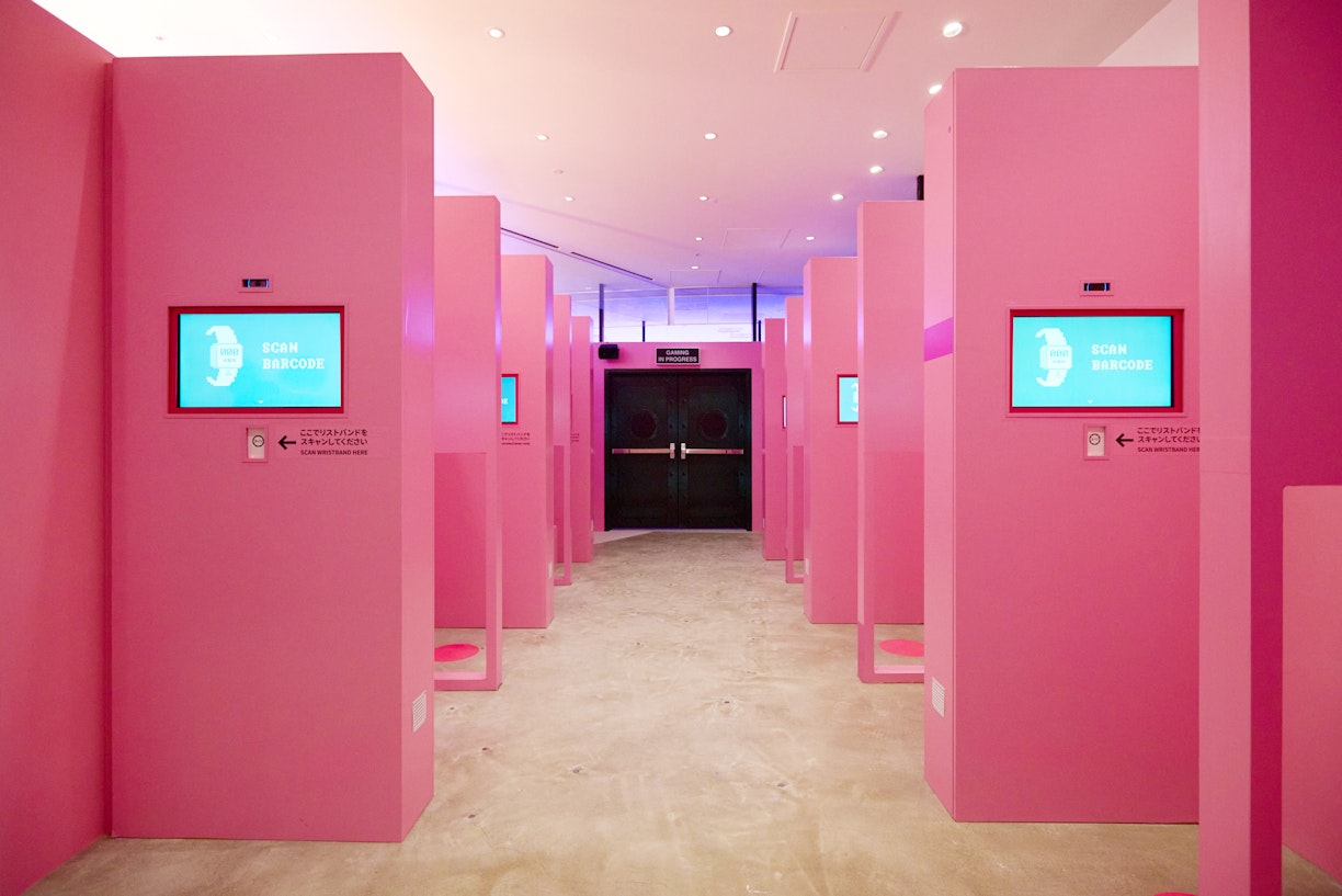 来場者は入場後、「FACE SCAN」ゾーンで顔をスキャンし、プレイヤーとして登録されます。鮮烈な色彩と不穏なコントラストに満ちた空間で自動音声の指示に従ううちに、現実からフィクションへと静かに引き込まれていきます。