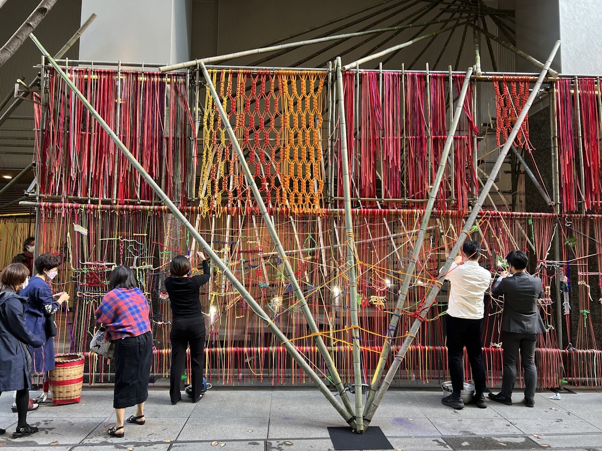 芸術グループSlow Art Collectiveが持続可能性や多文化共生をテーマに、竹やロープなどの自然素材、街で拾い集めた素材を用いた市民参加型のアートプロジェクトを展開。「Slow Art Collective Tokyo」(2022年)制作風景、東京サンケイビル